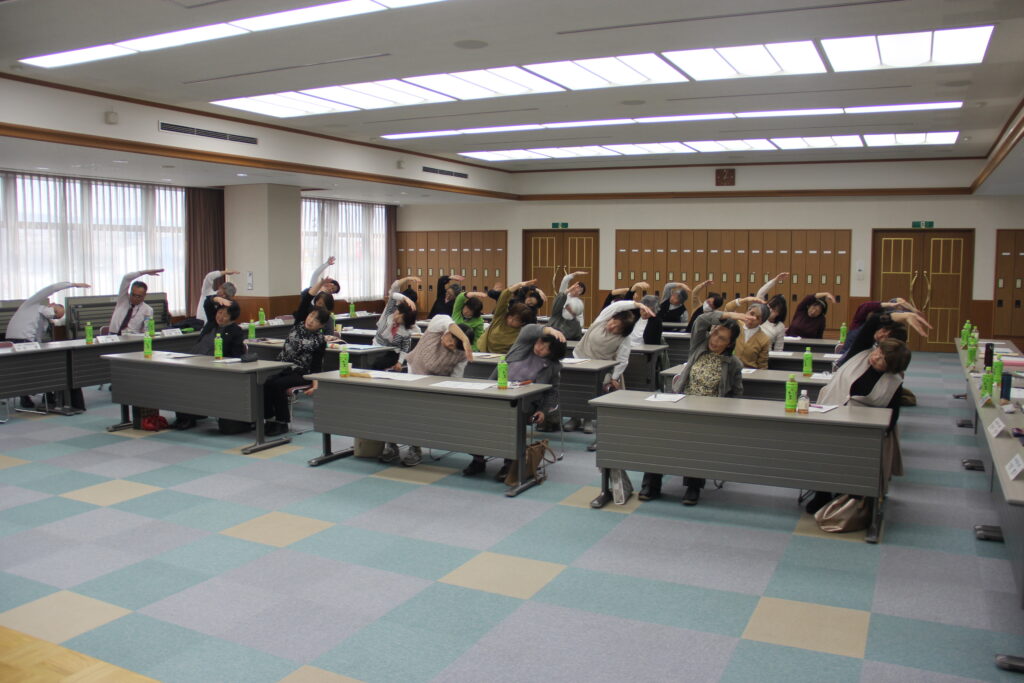 認知症予防は毎日コツコツ継続することが大切であると話があり、参加者全員で体操や脳トレーニングを体験しました。