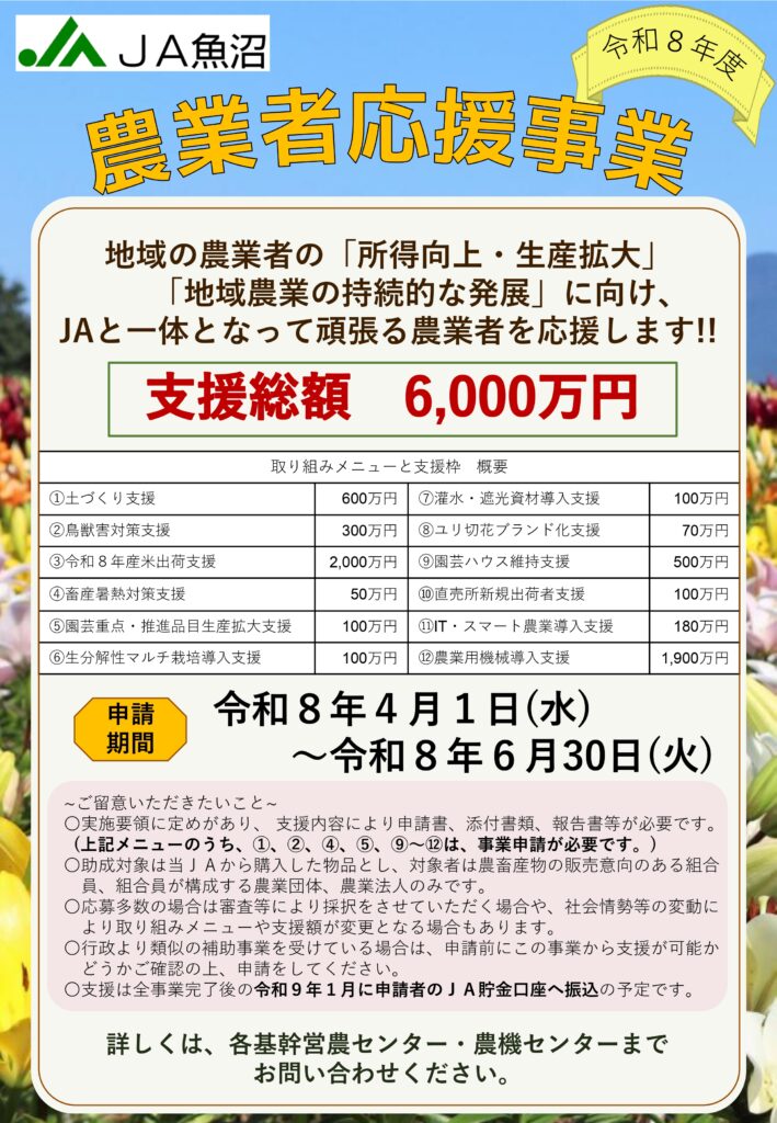 農業用機械導入支援    水稲およびJAが定めた園芸重点・推進品目の面積の維持および拡大、新規品目導入に必要な機械の更新、導入をする者・申請時の経営面積 水稲3ha、園芸3a以上の農業者とする。