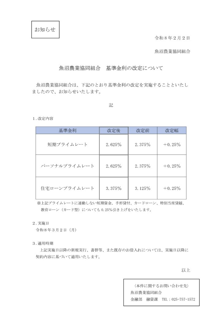 魚沼農業協同組合は、令和8年3月2日(月)より基準金利の改定を実施することといたしましたので、お知らせいたします。