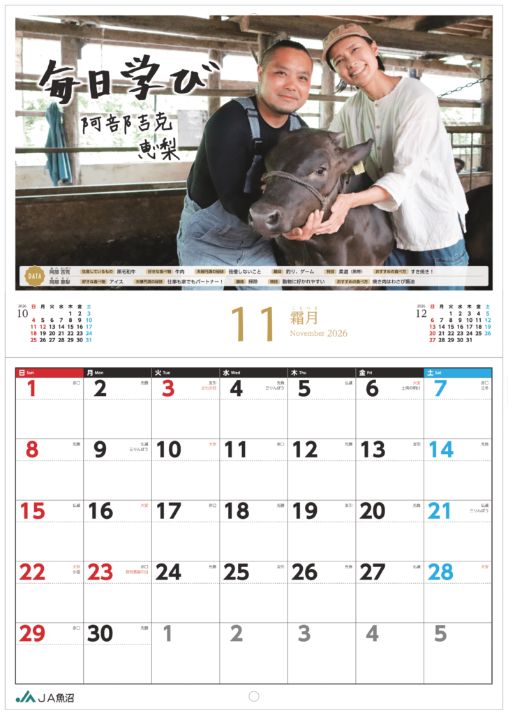 JA魚沼管内に住んでいる若手生産者を紹介するオリジナルレシピカレンダーです。熱い直筆のモットーやおすすめの食べ方にも注目!各地区で頑張る若手生産者が毎月登場します!