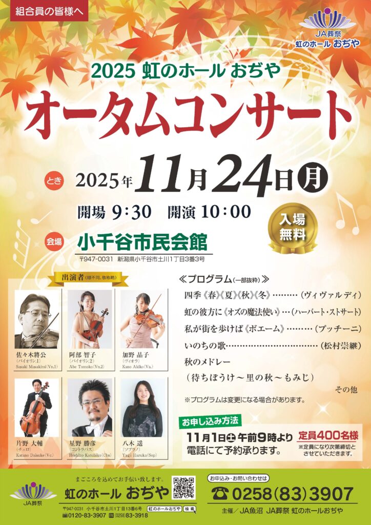 【お知らせ】オータムコンサート開催について(11/1受付開始)【虹のホールおぢや】